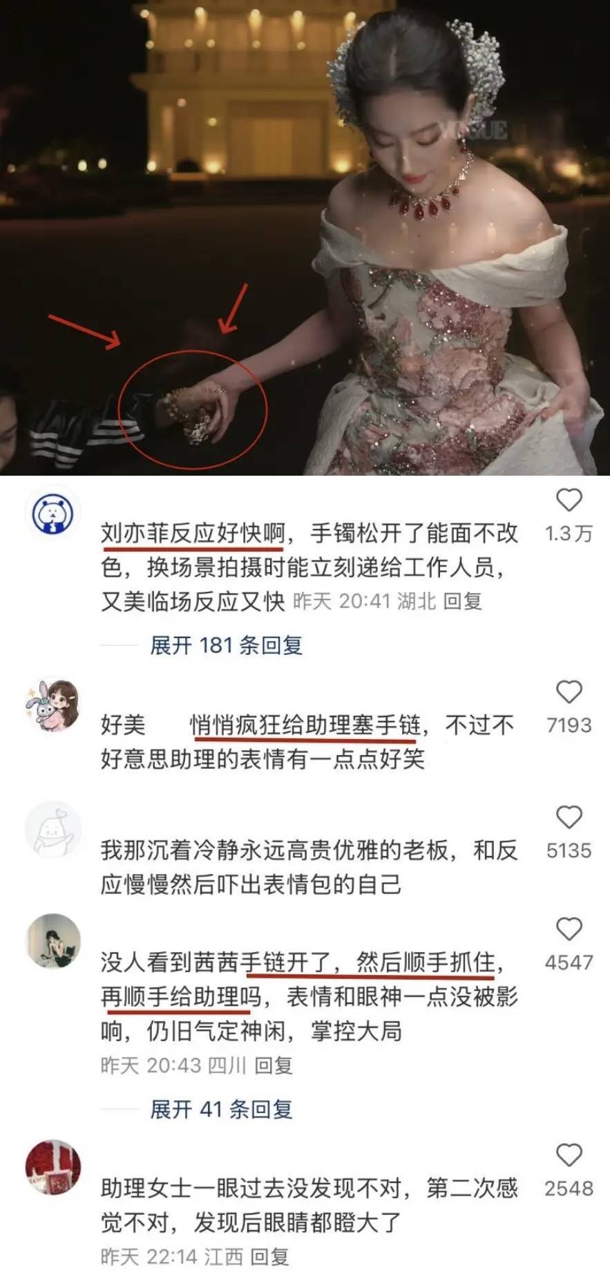 还好刘亦菲足够机智,她面不改色的将快要掉落的镯子攥在手心,工作人员搀扶的时候就把镯子转移到对方手里了。
