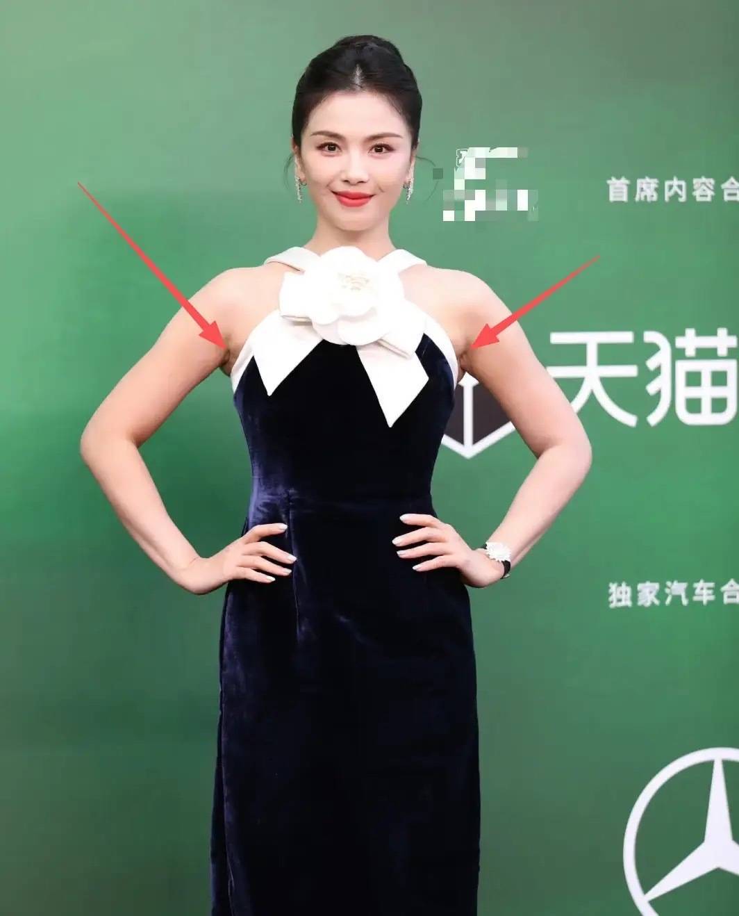 刘涛穿挂脖丝绒长裙,走的是贵妇风。不过上臂粗壮、显得整个人很结实。尤其是腋下副乳突出、胳膊肩膀肌肉感强,身上的“攻击性”太强了。