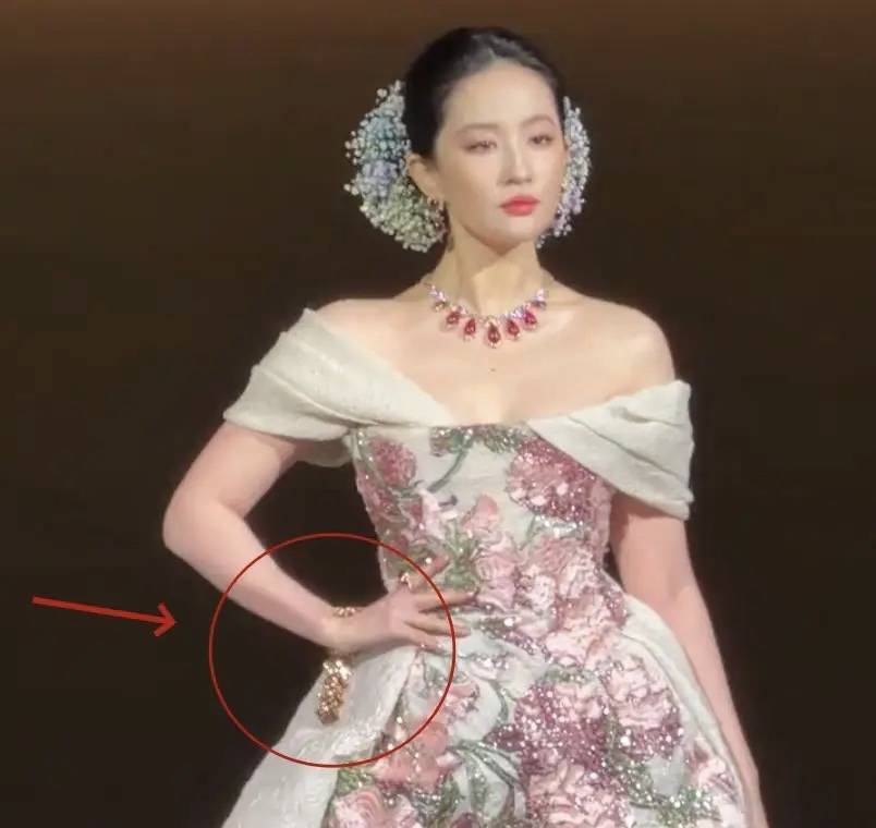 当天刘亦菲穿了很华丽的裙子,一眼望去奢华高贵,满头的簪花造型也很闪耀。可手腕上的镯子、真是太不争气了。