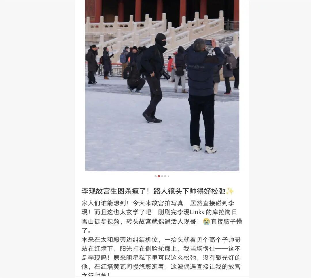 有偶遇的路人告诉极目新闻记者,13日上午9时许,他在故宫太和殿附近见到了李现,还跟他打了招呼:“他是来故宫拍雪景的,现实中的李现帅得很松弛,我才刷完他在西藏的视频,没想到马上就偶遇了,非常幸运。”